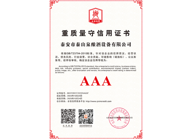 泰安市泰山泉釀酒設(shè)備有限公司,是一家專業(yè)從事釀酒設(shè)備機(jī)械化研發(fā)并集技術(shù)咨詢,工程設(shè)計(jì),制造安裝,人員培訓(xùn)及售后服務(wù)為一體的綜合性企業(yè),本公司主要產(chǎn)品為:大曲清香、小曲清香、大曲醬香、大曲濃香等香型白酒機(jī)械化設(shè)備。 本公司與中國科學(xué)院自動(dòng)化研究所簽訂技術(shù)服務(wù)合同,引進(jìn)先進(jìn)技術(shù),研究生產(chǎn)全自動(dòng)化機(jī)械釀酒設(shè)備,由中國科學(xué)自動(dòng)化研究所的技術(shù)支持,打造最先進(jìn)的生產(chǎn)釀酒設(shè)備,公司有信心打造全國最先進(jìn)白酒...